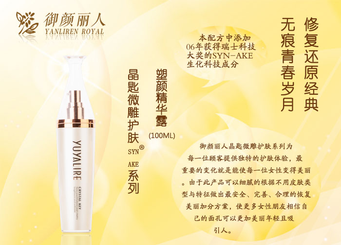 “御顏麗人”意在致力開發(fā)、設(shè)計出真正適合亞洲人,特別是中國人膚質(zhì)的護膚產(chǎn)品?!案呱猩罡裾{(diào)源于簡約自然的保養(yǎng)”,秉承這樣的護膚理念,經(jīng)過多年的市場檢驗,證明了“御顏麗人”定位的成功,并受到了消費者的一致認可。
